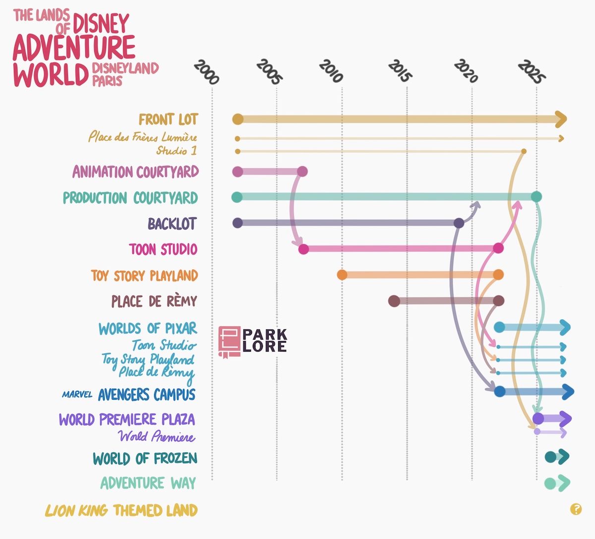 Given need for a genuine PR restart, Disney announced that Walt Disney Studios would relaunch in 2026 under a whole new name: Disney Adventure World. It’s a fittingly generic name for a sort of post-studio, catch-all IP park serving as the living embodiment of Disney+ Parks mentality. Alongside the rebrand, nearly all of the park’s existing spaces would be renamed, fractured, combined, segmented out again, and then reformed once more, absorbing and expunging elements in what sounds like (but certainly doesn’t functionally feel like) a “master-planned” rebirth.